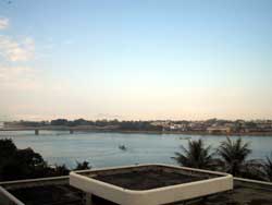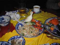 午後7時に、フエ到着。飛行場から宮廷料理が出るレストランへバスで移動。そのレストランがいかにも観光客が連れてこられるようなレストランで、宮廷にふさわしい衣装を着せられ、ベトナムの民芸楽器を使った生演奏が鳴り響く大部屋に通され、写真を売りつけられ・・・という、ちょっと勘弁の歓迎を受け、またそこで出されたオシボリが、便所の芳香剤に漬けてあったのではないかと思う香りをはなっていた。
